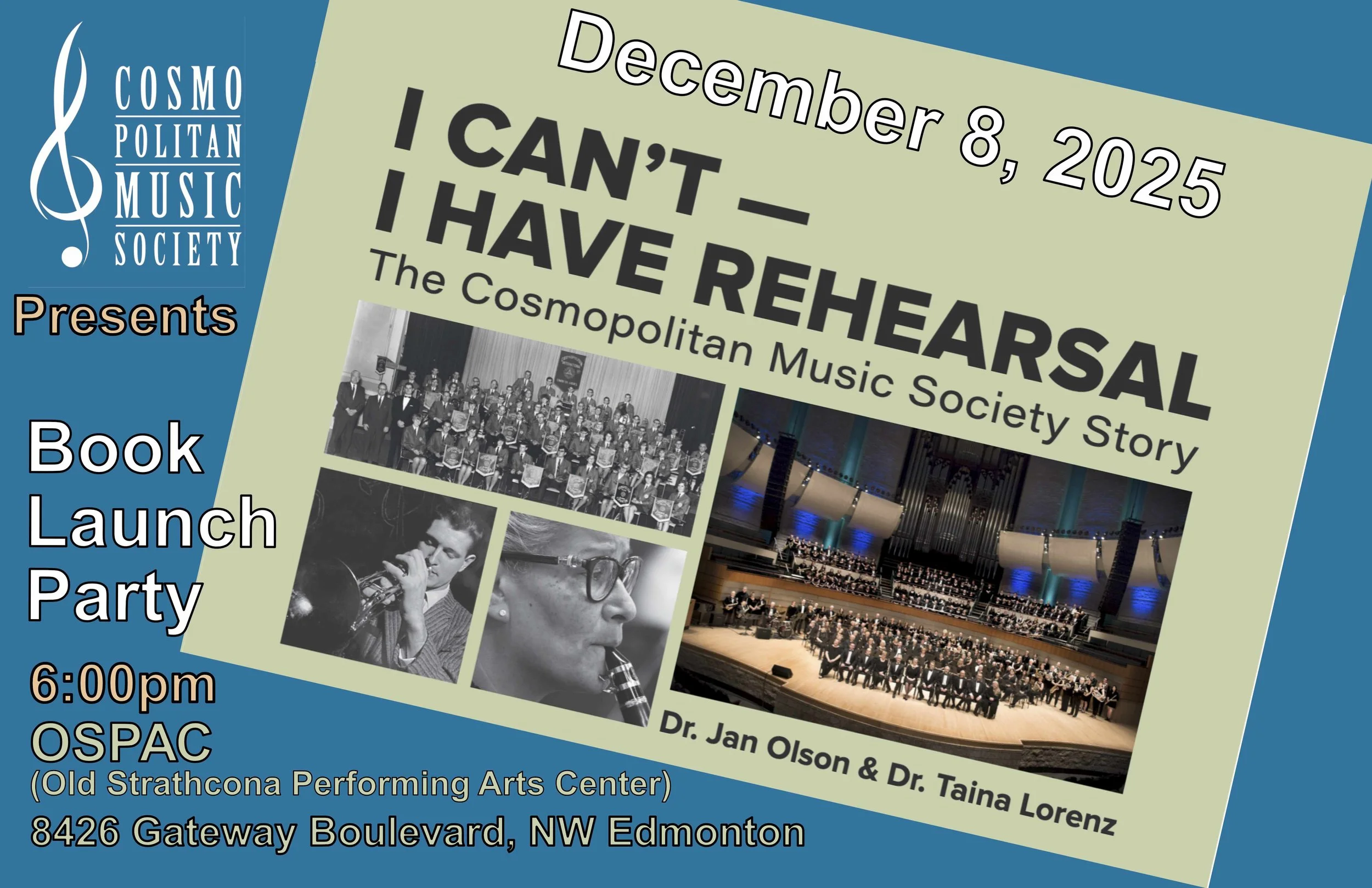 Join us for the official launch of our book, “I Can’t - I Have Rehearsal” on December 8 at 6pm at our home in the Old Strathcona Performing Arts Centre. Drs. Jan and Taina will be present to talk about the book and the CMS story and sign your copies. The CMS Concession will feature happy hour prices and snacks. You don’t want to miss this special event!
